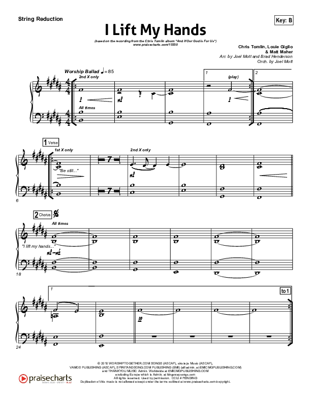 Download the Orchestration for I Lift My Hands by Chris Tomlin, from the album And If Our God Is For Us. This song was arranged by Joel Mott / Brad Henderson in the key of B, Bb.