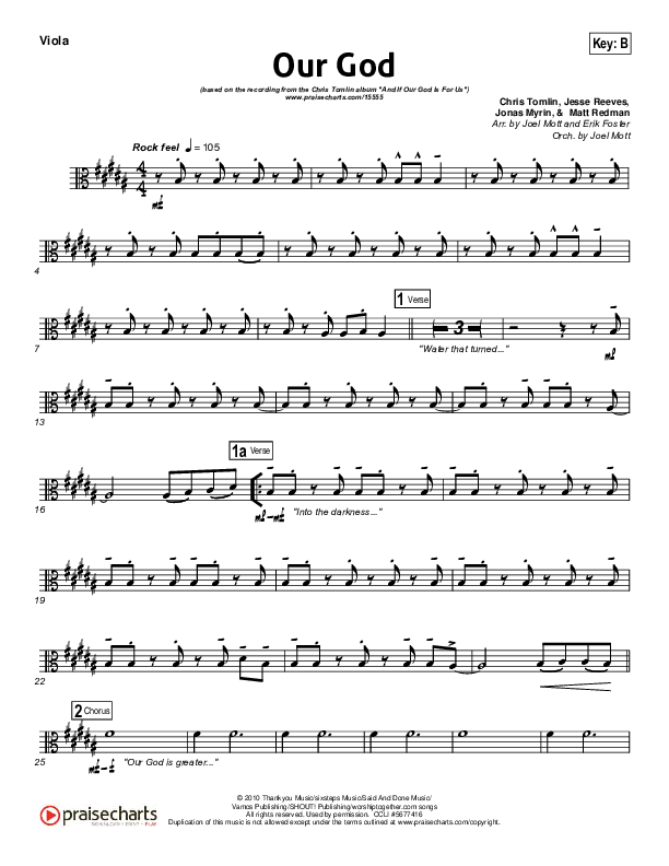 Download the Viola sheet music for Our God by Chris Tomlin, from the album And If Our God Is For Us. This song was arranged by Joel Mott / Erik Foster in the key of A, B, Bb, C, G.