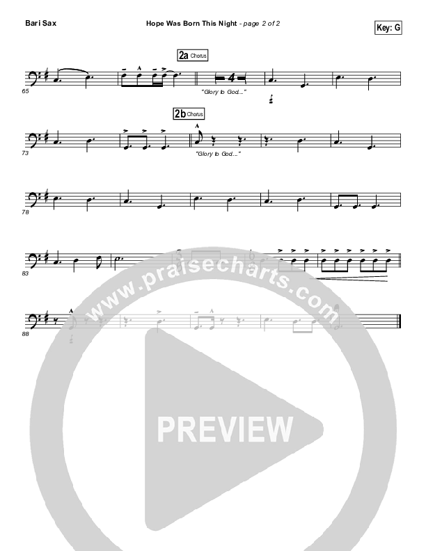 Download the Bari Sax sheet music for Hope Was Born This Night by Sidewalk Prophets, from the album Come Now Our King. This song was arranged by Brad Henderson in the key of F, G.