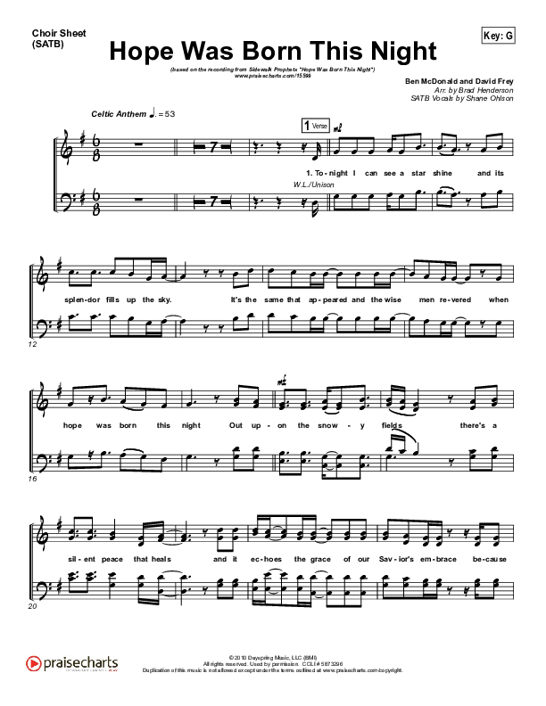 Download the Choir Sheet for Hope Was Born This Night by Sidewalk Prophets, from the album Come Now Our King. This song was arranged by Brad Henderson in the key of F, G.