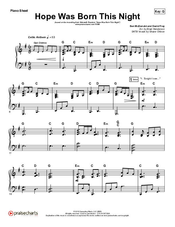 Download the Orchestration for Hope Was Born This Night by Sidewalk Prophets, from the album Come Now Our King. This song was arranged by Brad Henderson in the key of F, G.
