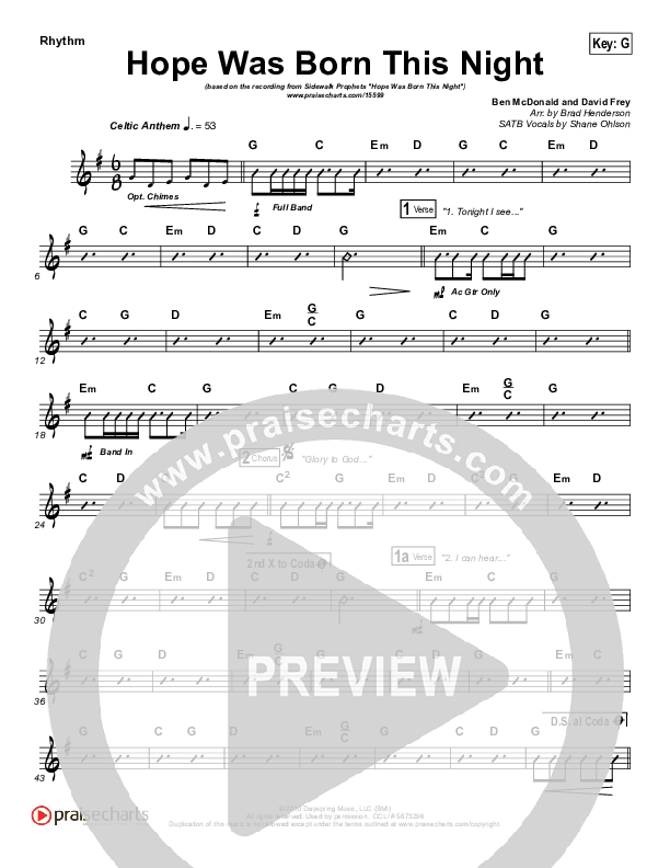 Download the Rhythm Chart for Hope Was Born This Night by Sidewalk Prophets, from the album Come Now Our King. This song was arranged by Brad Henderson in the key of F, G.