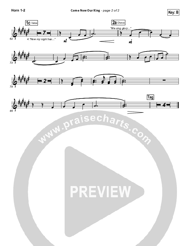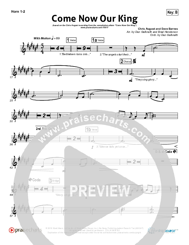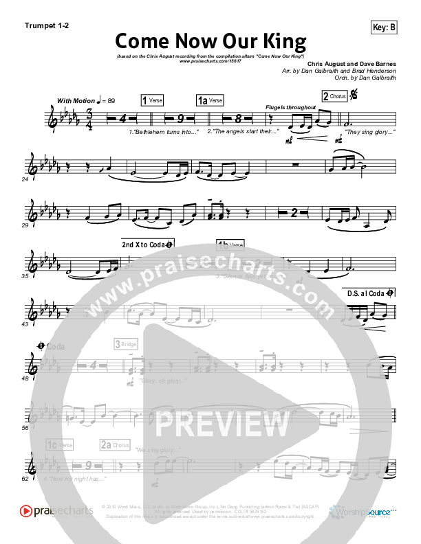 Download the Orchestration brass parts for Come Now Our King by Chris August, from the album WOW Christmas Silver. This song was arranged by Daniel Galbraith / Brad Henderson in the key of B, Bb.