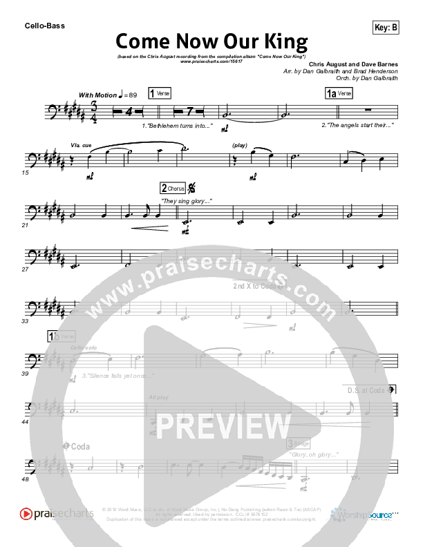 Download the Orchestration for Come Now Our King by Chris August, from the album WOW Christmas Silver. This song was arranged by Daniel Galbraith / Brad Henderson in the key of B, Bb.
