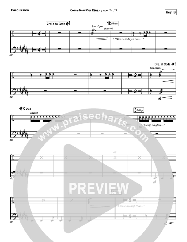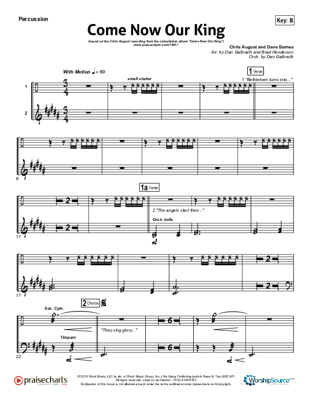Download the percussion sheet music for Come Now Our King by Chris August, from the album WOW Christmas Silver. This song was arranged by Daniel Galbraith / Brad Henderson in the key of B, Bb.