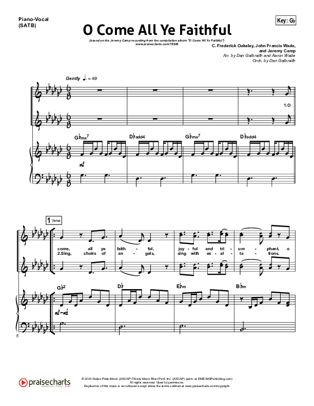 Download the sheet music for O Come All Ye Faithful by Jeremy Camp, from the album O Come All Ye Faithful. This song was arranged by Daniel Galbraith / Aaron Wade in the key of F, Gb.