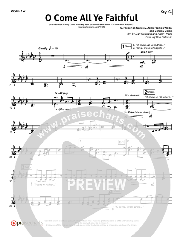 Download the Violin sheet music for O Come All Ye Faithful by Jeremy Camp, from the album O Come All Ye Faithful. This song was arranged by Daniel Galbraith / Aaron Wade in the key of F, Gb.