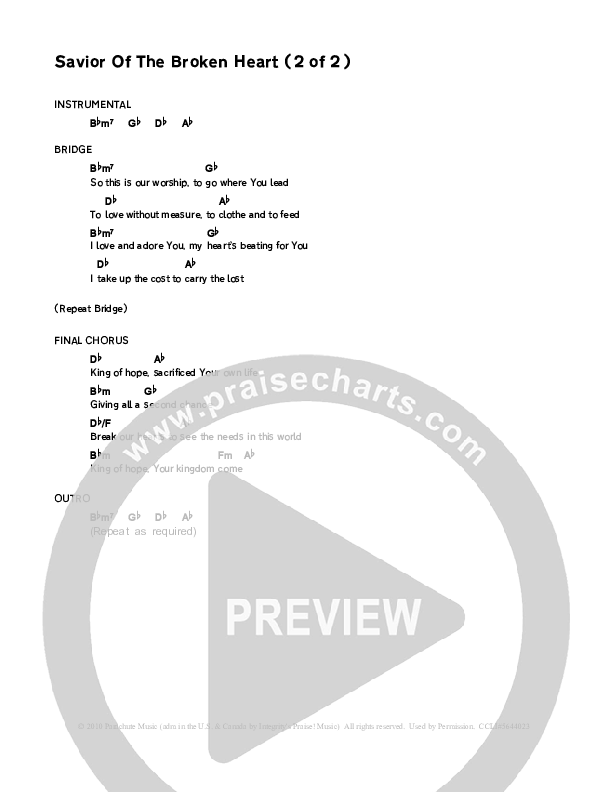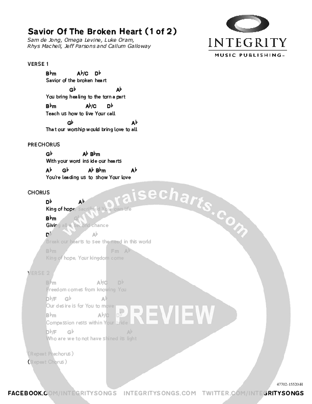 Download the PDF Chord Charts for Savior Of The Broken Heart by Parachute Band, from the album Love Without Measure. This song was arranged by Integrity Music in the key of Db.