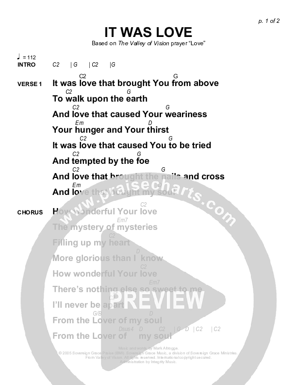 Download the PDF Chord Charts for It Was Love by Sovereign Grace, from the album Valley Of Vision.