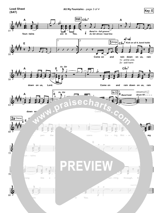 Download the sheet music for All My Fountains by Chris Tomlin / Passion, from the album Here For You. This song was arranged by Joel Mott / Jared Haschek in the key of D, E.