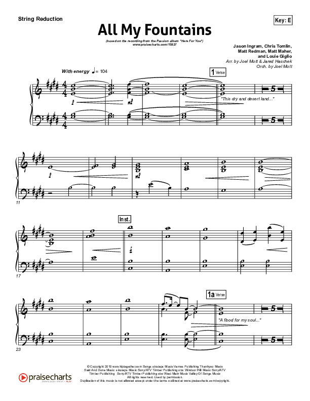 Download the Orchestration for All My Fountains by Chris Tomlin / Passion, from the album Here For You. This song was arranged by Joel Mott / Jared Haschek in the key of D, E.