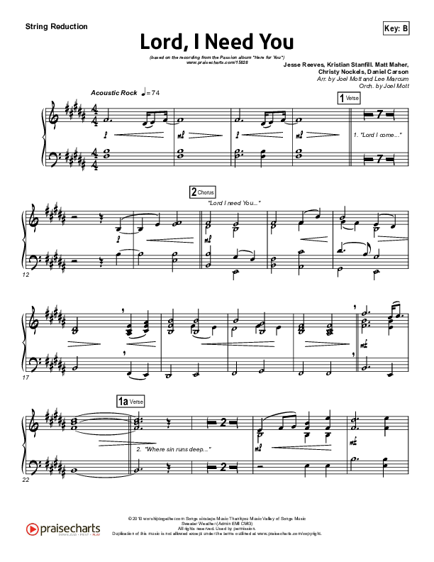 Download the Orchestration string parts for Lord I Need You by Chris Tomlin / Passion, from the album Here For You. This song was arranged by Joel Mott / Lee Marcum in the key of B, C.