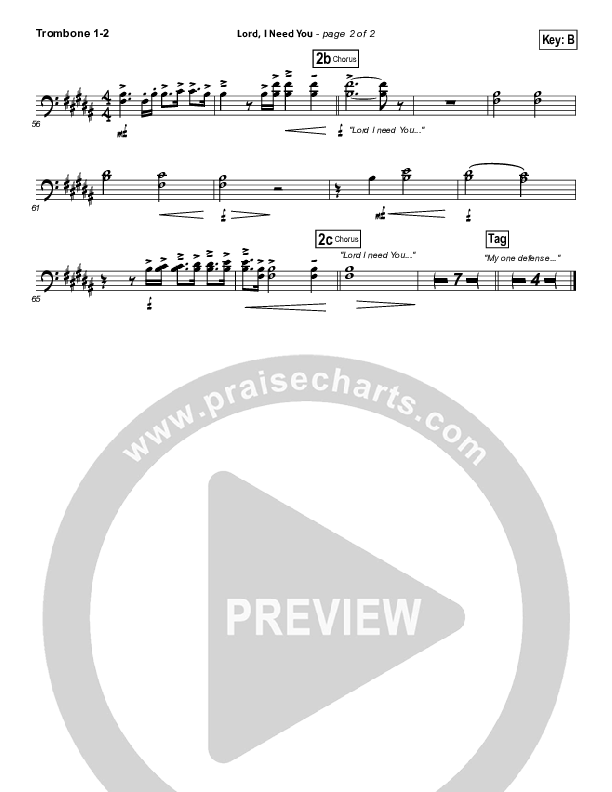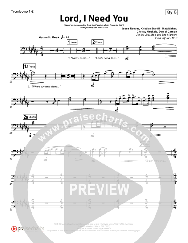 Download the Trombone 1,2 sheet music for Lord I Need You by Chris Tomlin / Passion, from the album Here For You. This song was arranged by Joel Mott / Lee Marcum in the key of B, C.