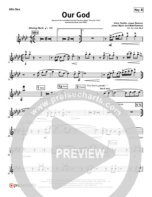 Download the AltoSax sheet music for Our God by Chris Tomlin / Passion, from the album Here For You. This song was arranged by Joel Mott in the key of A, B.