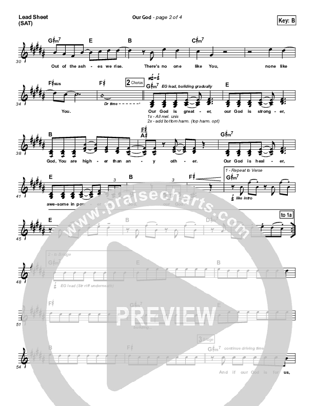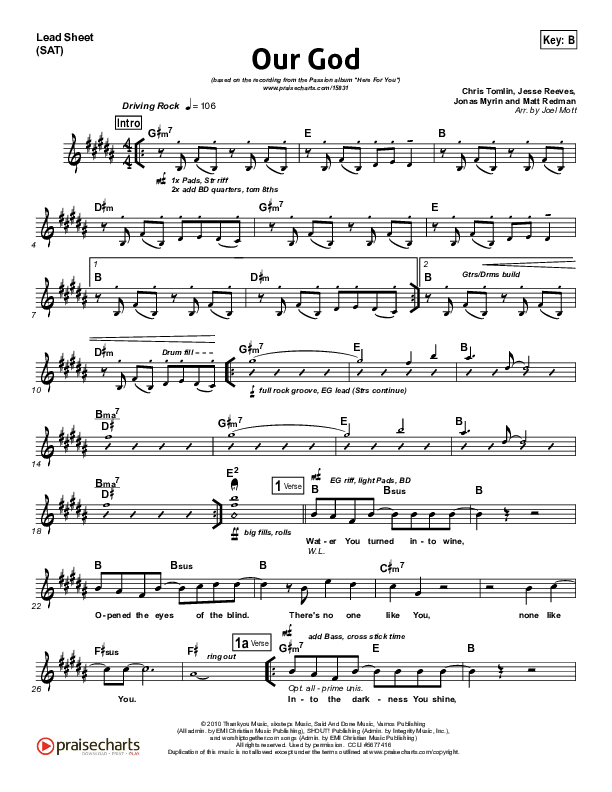 Download the sheet music for Our God by Chris Tomlin / Passion, from the album Here For You. This song was arranged by Joel Mott in the key of A, B.