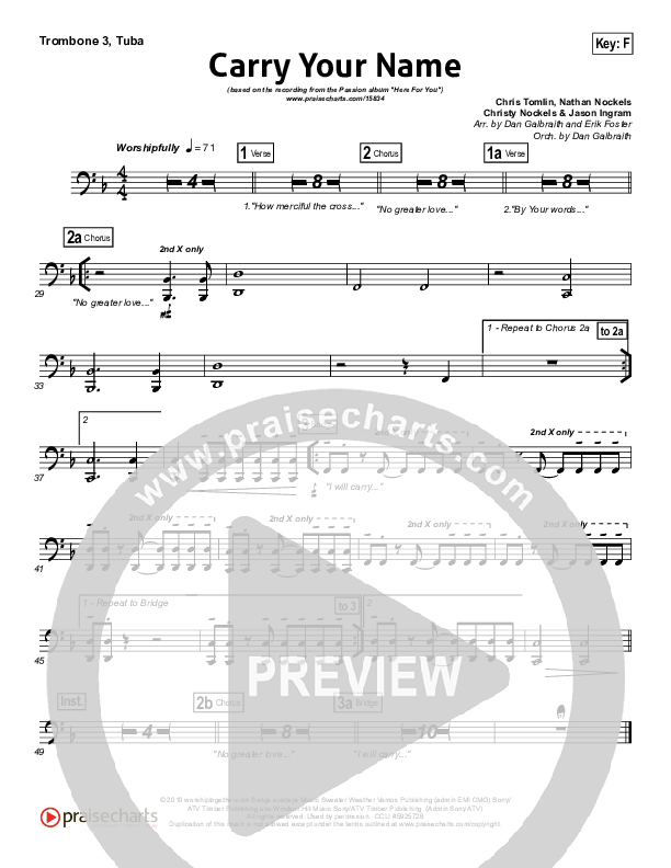 Download the Trombone 3/Tuba sheet music for Carry Your Name by Christy Nockels / Passion, from the album Here For You. This song was arranged by Daniel Galbraith / Erik Foster in the key of F, G.