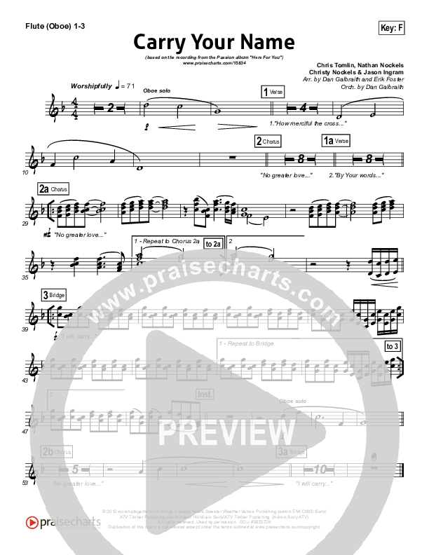 Download the Orchestration wind parts for Carry Your Name by Christy Nockels / Passion, from the album Here For You. This song was arranged by Daniel Galbraith / Erik Foster in the key of F, G.