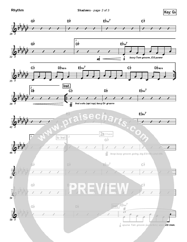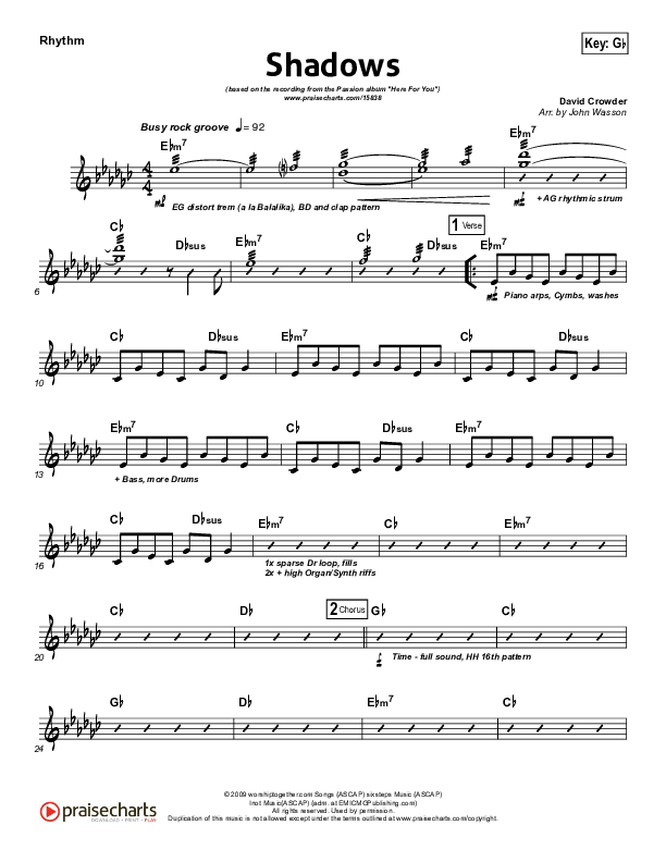 Download the Rhythm Chart for Shadows by David Crowder / Passion, from the album Here For You. This song was arranged by John Wasson in the key of F, Gb.
