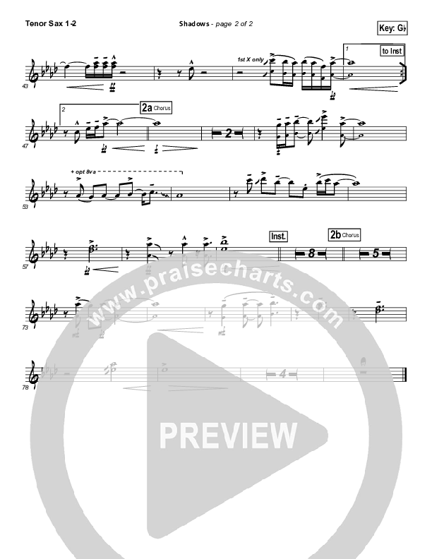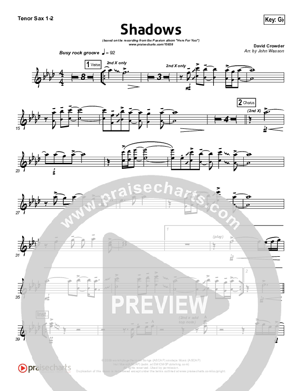 Download the Tenor Sax sheet music for Shadows by David Crowder / Passion, from the album Here For You. This song was arranged by John Wasson in the key of F, Gb.