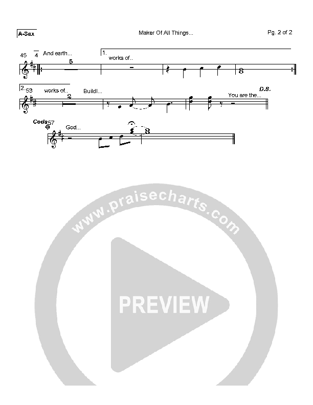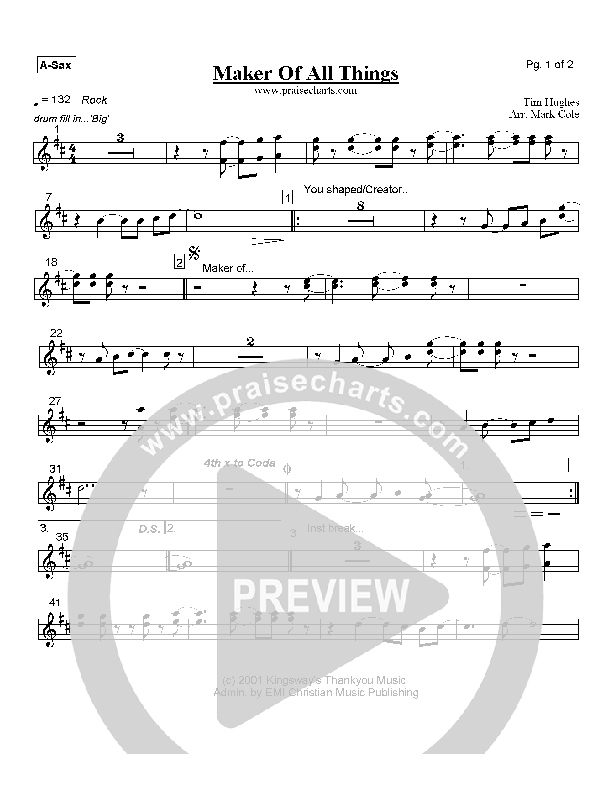 Download the AltoSax sheet music for Maker of All Things by Tim Hughes, from the album Here I Am To Worship. This song was arranged by Mark Cole in the key of F, G.