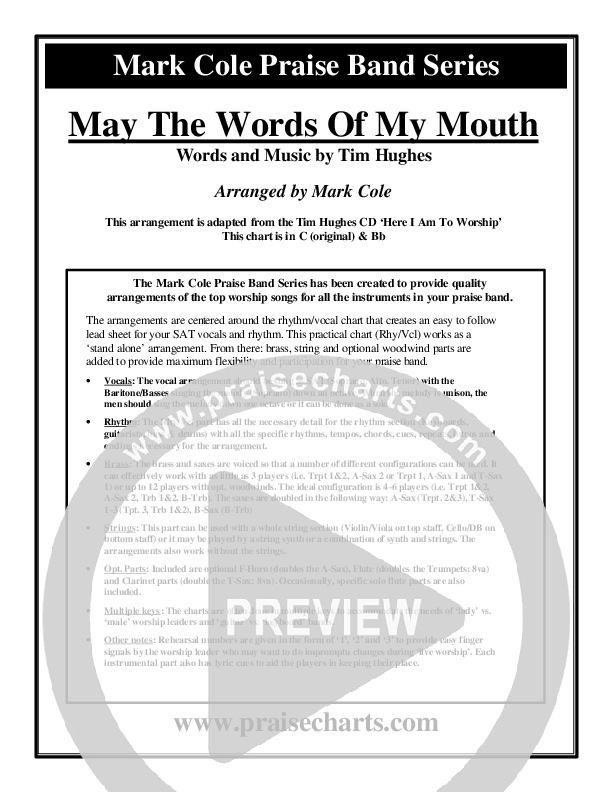 Download the Orchestration for May The Words Of My Mouth by Tim Hughes, from the album Here I Am To Worship. This song was arranged by Mark Cole in the key of Bb, C.