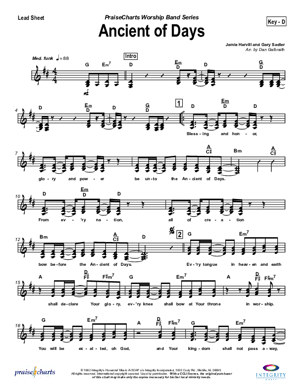 Download the sheet music for Ancient Of Days by Ron Kenoly, from the album WOW Worship Blue. This song was arranged by Daniel Galbraith in the key of C, D.