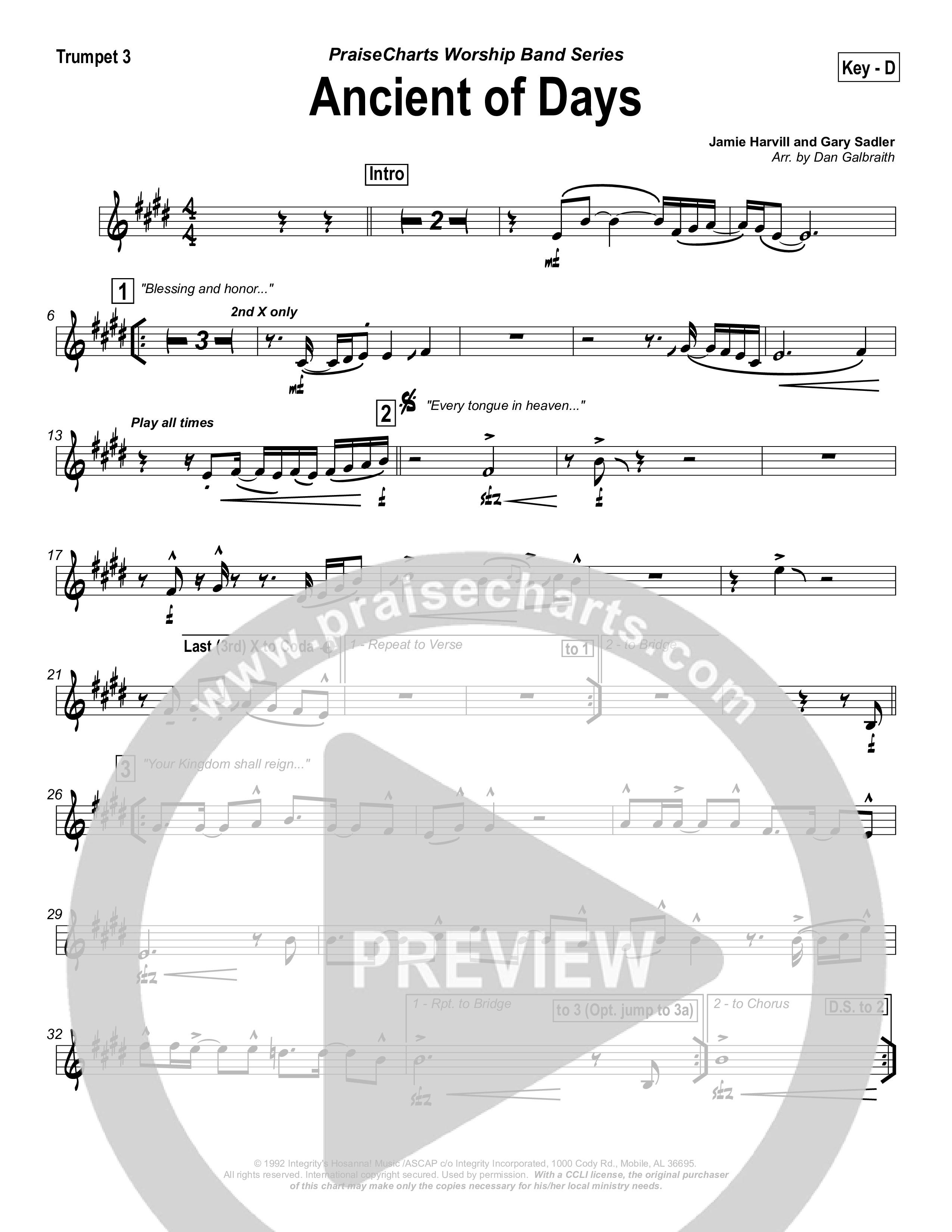 Download the Trumpet 3 sheet music for Ancient Of Days by Ron Kenoly, from the album WOW Worship Blue. This song was arranged by Daniel Galbraith in the key of C, D.