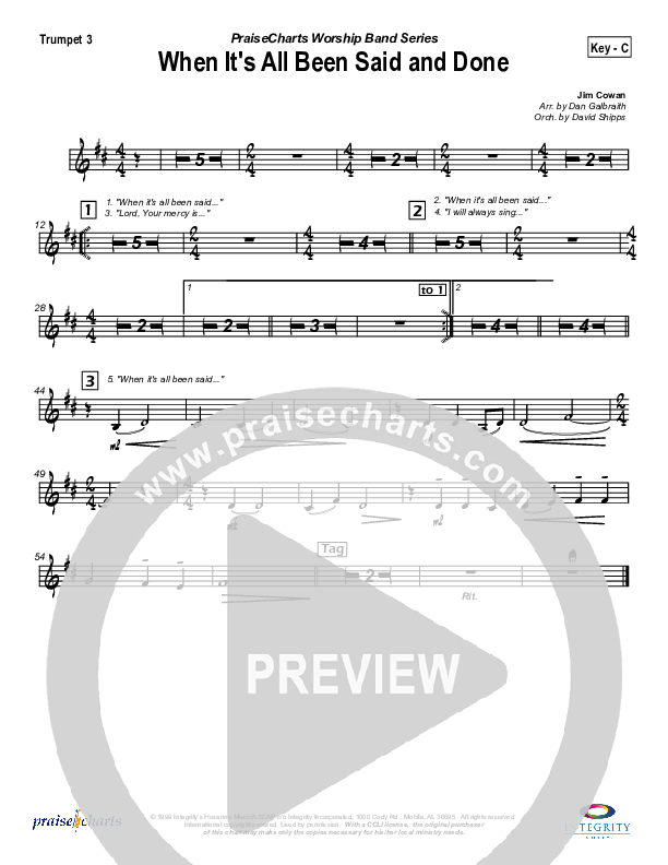 Download the Trumpet 3 sheet music for When It's All Been Said And Done by Robin Mark, from the album Revival In Belfast. This song was arranged by Daniel Galbraith / David Shipps in the key of C, D.