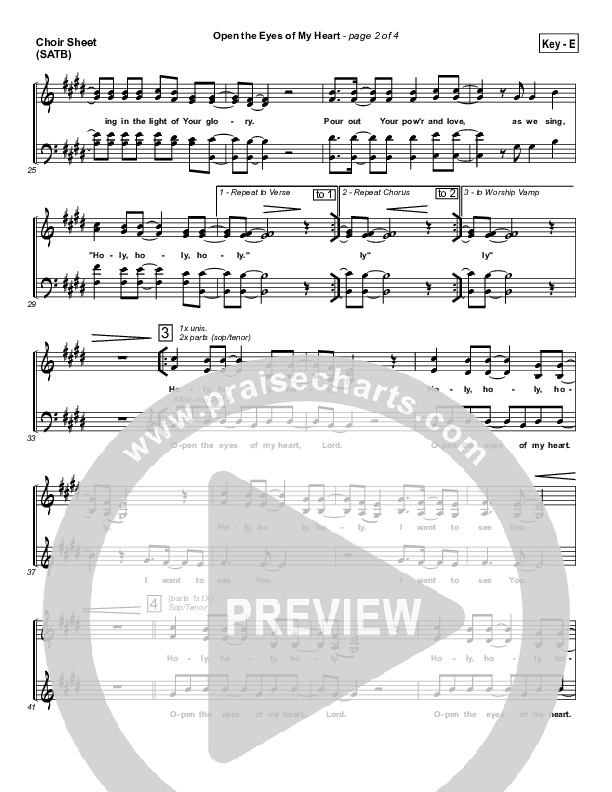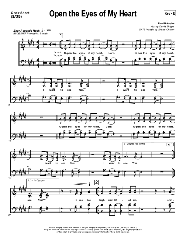 Download the Choir Sheet for Open The Eyes Of My Heart by Paul Baloche, from the album WOW Worship Blue. This song was arranged by David Shipps in the key of D, E, F.