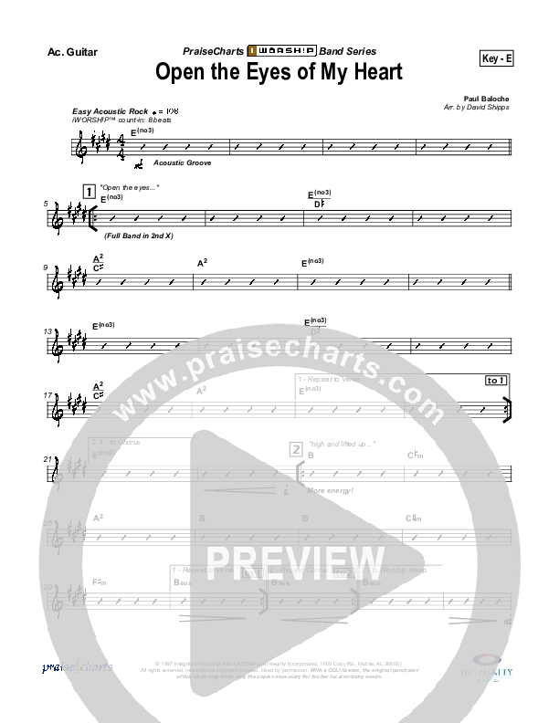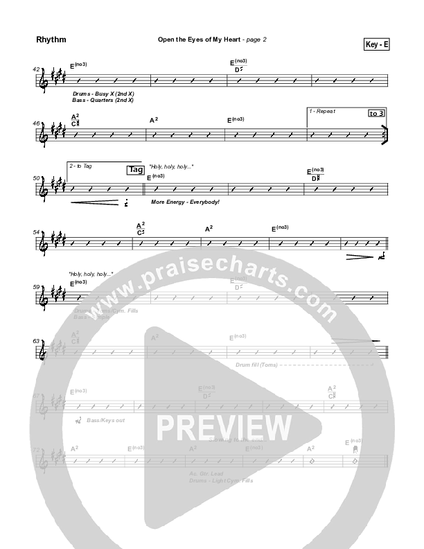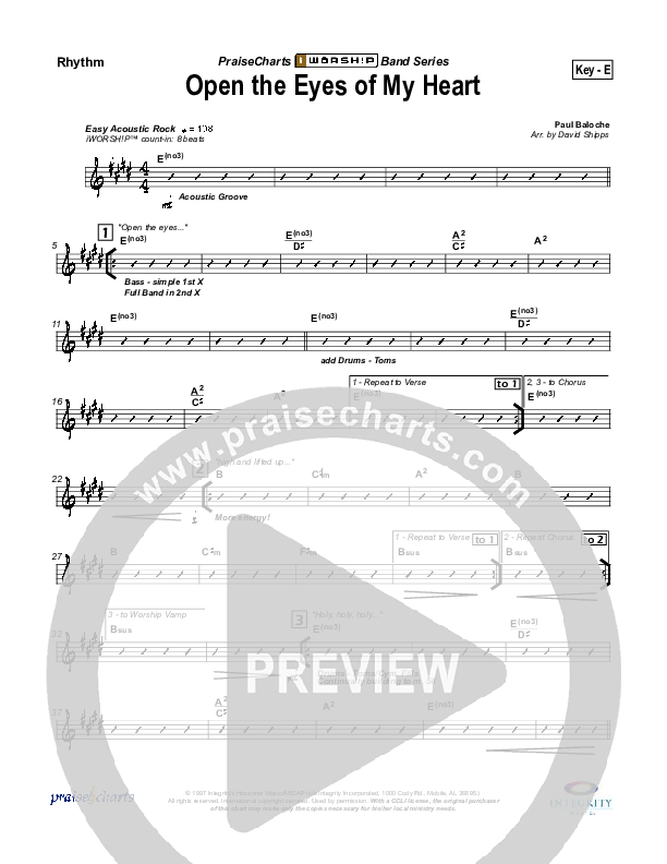 Download the Rhythm Chart for Open The Eyes Of My Heart by Paul Baloche, from the album WOW Worship Blue. This song was arranged by David Shipps in the key of D, E, F.