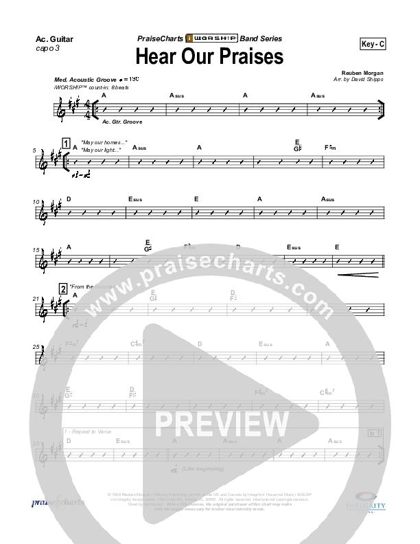 Download the Acoustic Guitar sheet music for Hear Our Praises by Hillsong Worship, from the album iWorship: DVD D. This song was arranged by David Shipps in the key of Bb, C.
