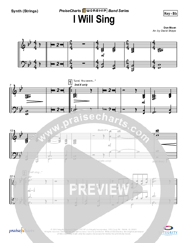 Download the Orchestration for I Will Sing by Don Moen, from the album iWorship: DVD E. This song was arranged by David Shipps in the key of Bb, C.