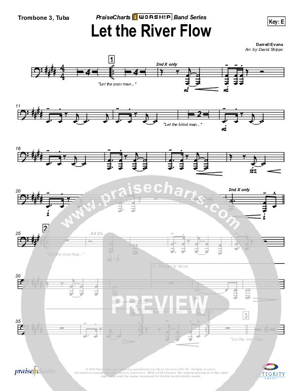Download the Trombone 3/Tuba sheet music for Let The River Flow by Darrell Evans, from the album iWorship: DVD D. This song was arranged by David Shipps in the key of E, F.
