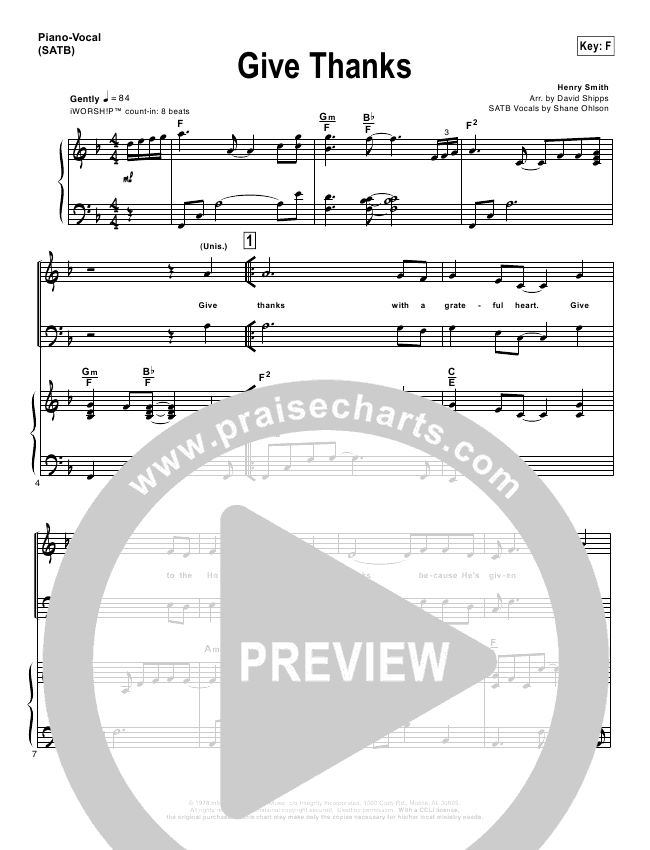 Download the sheet music for Give Thanks by Don Moen, from the album iWorship: DVD C. This song was arranged by David Shipps in the key of E, F.