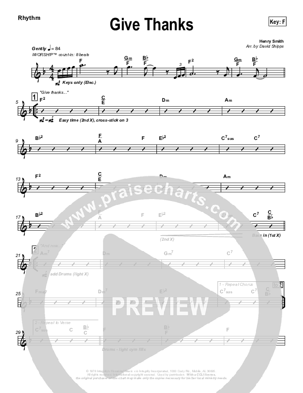 Download the Rhythm Chart for Give Thanks by Don Moen, from the album iWorship: DVD C. This song was arranged by David Shipps in the key of E, F.