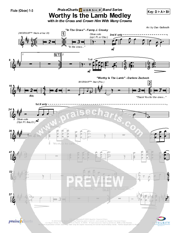 Download the Flute/Oboe sheet music for Worthy Is the Lamb (with In the Cross and Crown Him With Many Crowns) by Travis Cottrell, from the album Unashamed Love. This song was arranged by Daniel Galbraith in the key of D, Eb.
