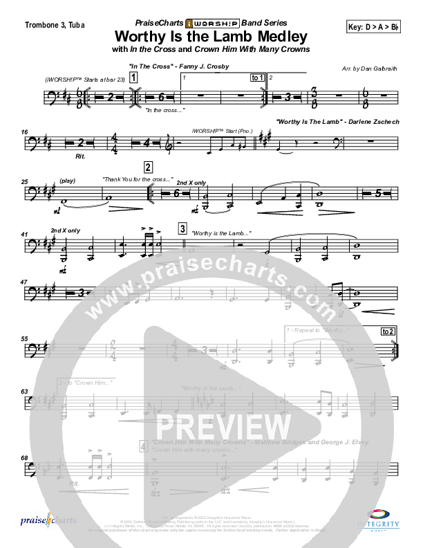 Download the Trombone 3/Tuba sheet music for Worthy Is the Lamb (with In the Cross and Crown Him With Many Crowns) by Travis Cottrell, from the album Unashamed Love. This song was arranged by Daniel Galbraith in the key of D, Eb.