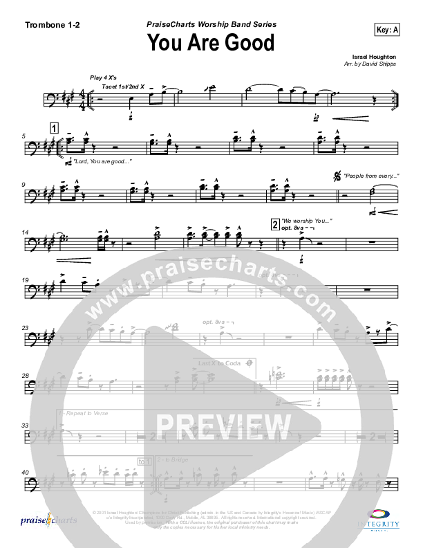 Download the Trombone 1,2 sheet music for You Are Good by Travis Cottrell, from the album Unashamed Love. This song was arranged by David Shipps in the key of A, Bb.