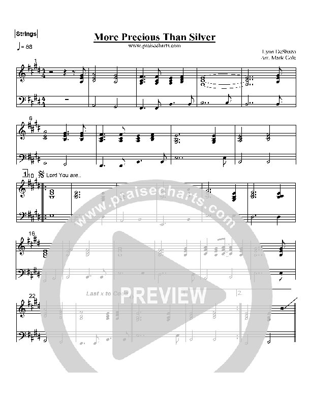 Download the Orchestration for More Precious Than Silver by Lynn DeShazo, from the album WOW Worship Blue. This song was arranged by Mark Cole in the key of D, E, F, G.