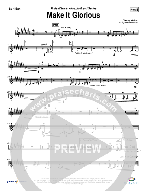 Download the Bari Sax sheet music for Make It Glorious by Jason Breland, from the album Believe. This song was arranged by Daniel Galbraith in the key of F.