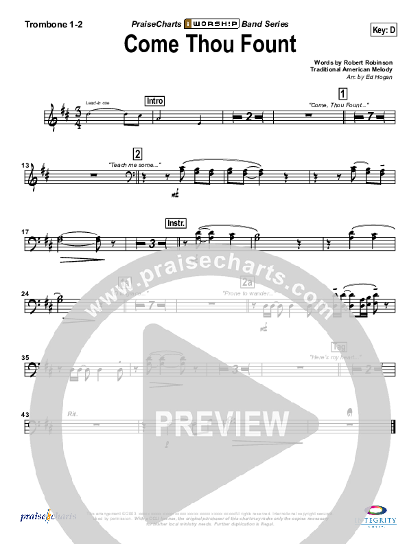 Download the Trombone 1,2 sheet music for Come Thou Fount Of Every Blessing by Bob Fitts, from the album iWorship: DVD F. This song was arranged by Ed Hogan in the key of D, Eb.
