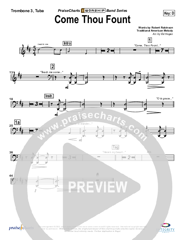 Download the Trombone 3/Tuba sheet music for Come Thou Fount Of Every Blessing by Bob Fitts, from the album iWorship: DVD F. This song was arranged by Ed Hogan in the key of D, Eb.