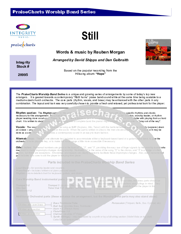 Download the Orchestration for Still by Hillsong Worship, from the album Hope. This song was arranged by David Shipps / Daniel Galbraith in the key of C, Db.