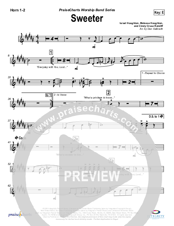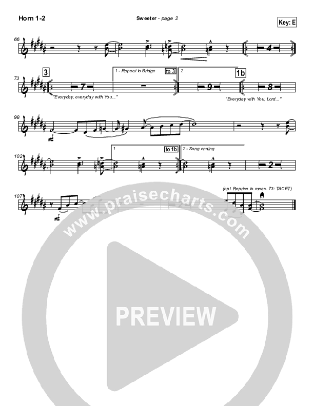 Download the Orchestration brass parts for Sweeter by Lakewood Church, from the album Cover the Earth. This song was arranged by Daniel Galbraith in the key of E, F.