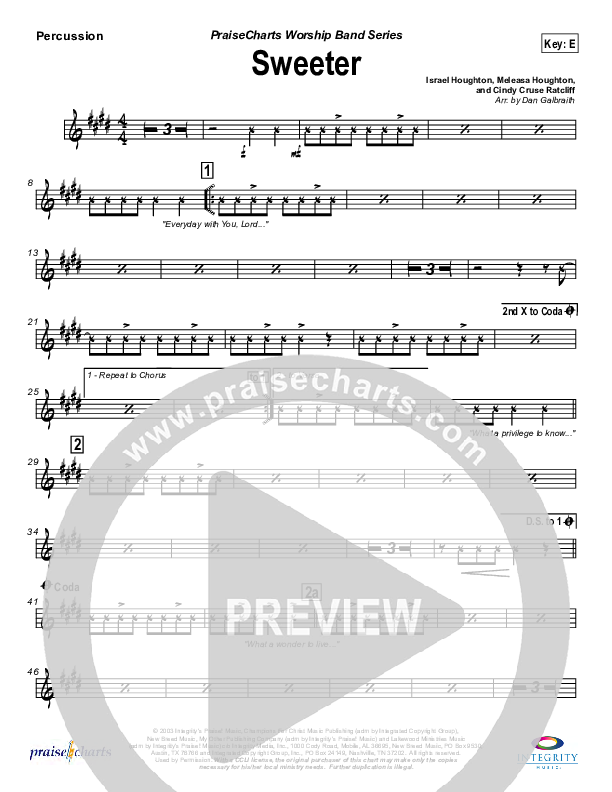 Download the percussion sheet music for Sweeter by Lakewood Church, from the album Cover the Earth. This song was arranged by Daniel Galbraith in the key of E, F.