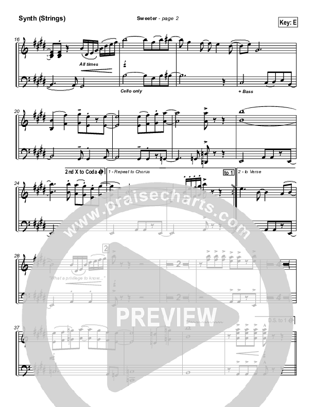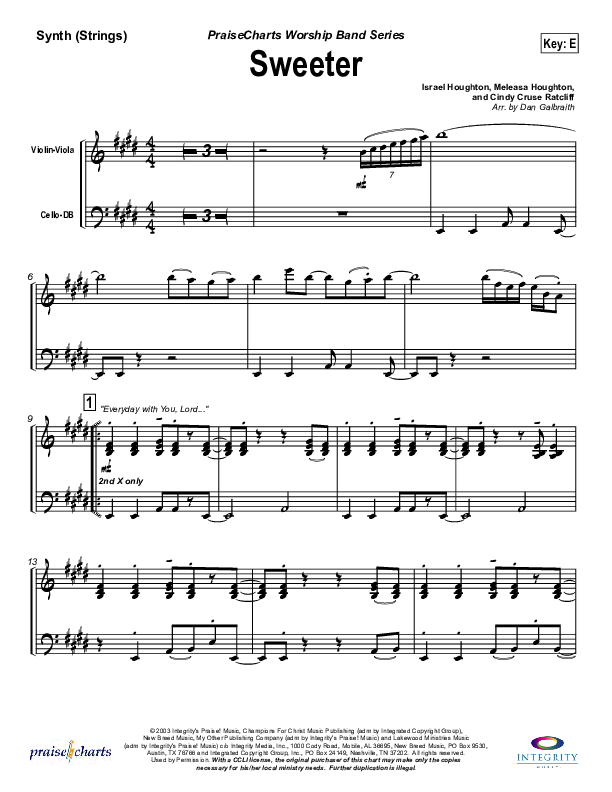 Download the Orchestration for Sweeter by Lakewood Church, from the album Cover the Earth. This song was arranged by Daniel Galbraith in the key of E, F.