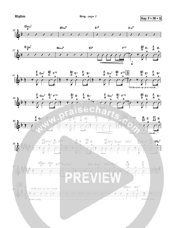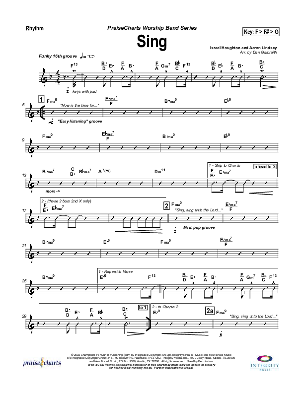 Download the Rhythm Chart for Sing by Lakewood Church, from the album Cover the Earth. This song was arranged by Daniel Galbraith in the key of F, G.