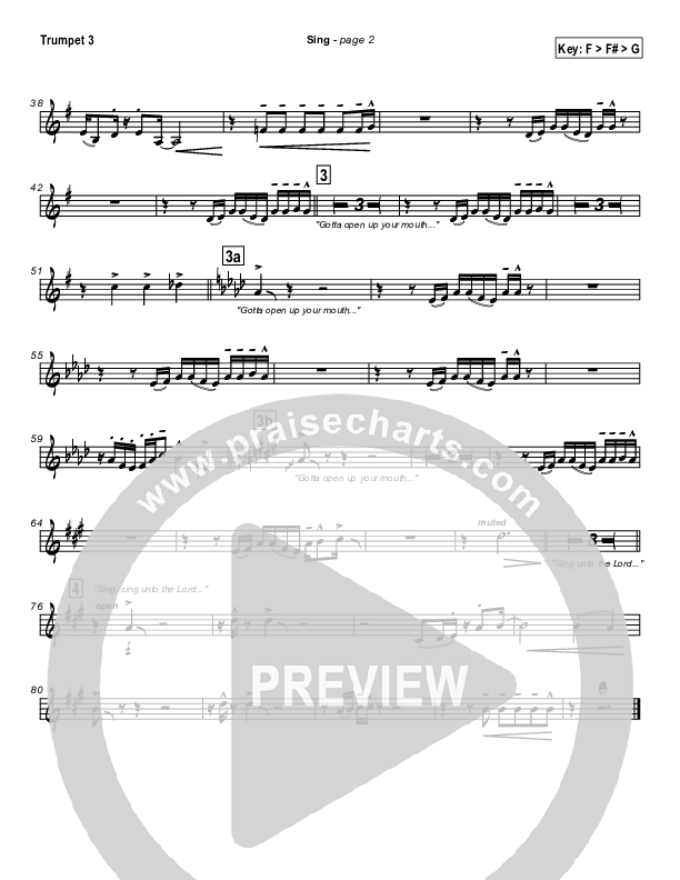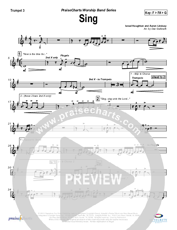 Download the Trumpet 3 sheet music for Sing by Lakewood Church, from the album Cover the Earth. This song was arranged by Daniel Galbraith in the key of F, G.