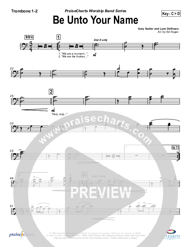 Download the Trombone 1,2 sheet music for Be Unto Your Name by Robin Mark, from the album iWorship: DVD E. This song was arranged by Ed Hogan in the key of Bb, C.