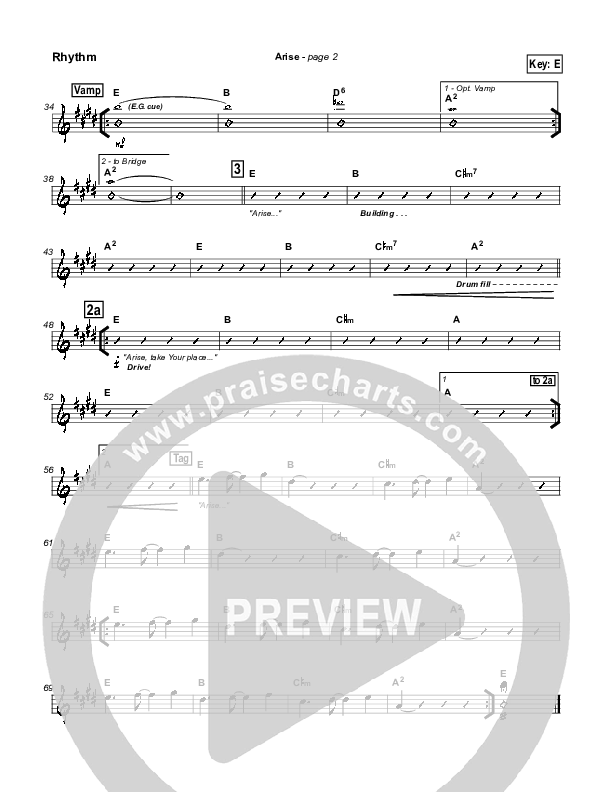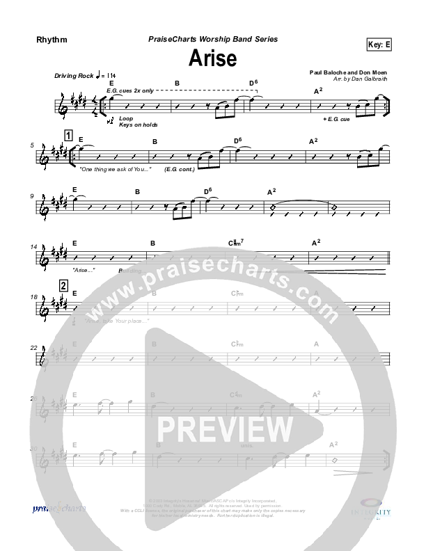 Download the Rhythm Chart for Arise by Paul Baloche, from the album Offering Of Worship. This song was arranged by Daniel Galbraith in the key of E, F.